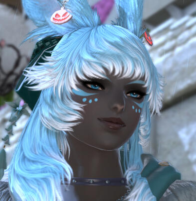 Appearance: Charcoal skin with pretty blue eyes and soft blue facial markings. Kafei is busty and tall, with long aqua blue hair with snow white accents that touches at mid thigh when it's not tied back into its usual tail. A small, fluffy rabbit tail that matches the color of her hair sits just above her rear. Usually, her hair is rather messy, and her ears needing groomed - but she's usually too into her work to worry about it. Has FFXII styled Viera feet, and natural claws.