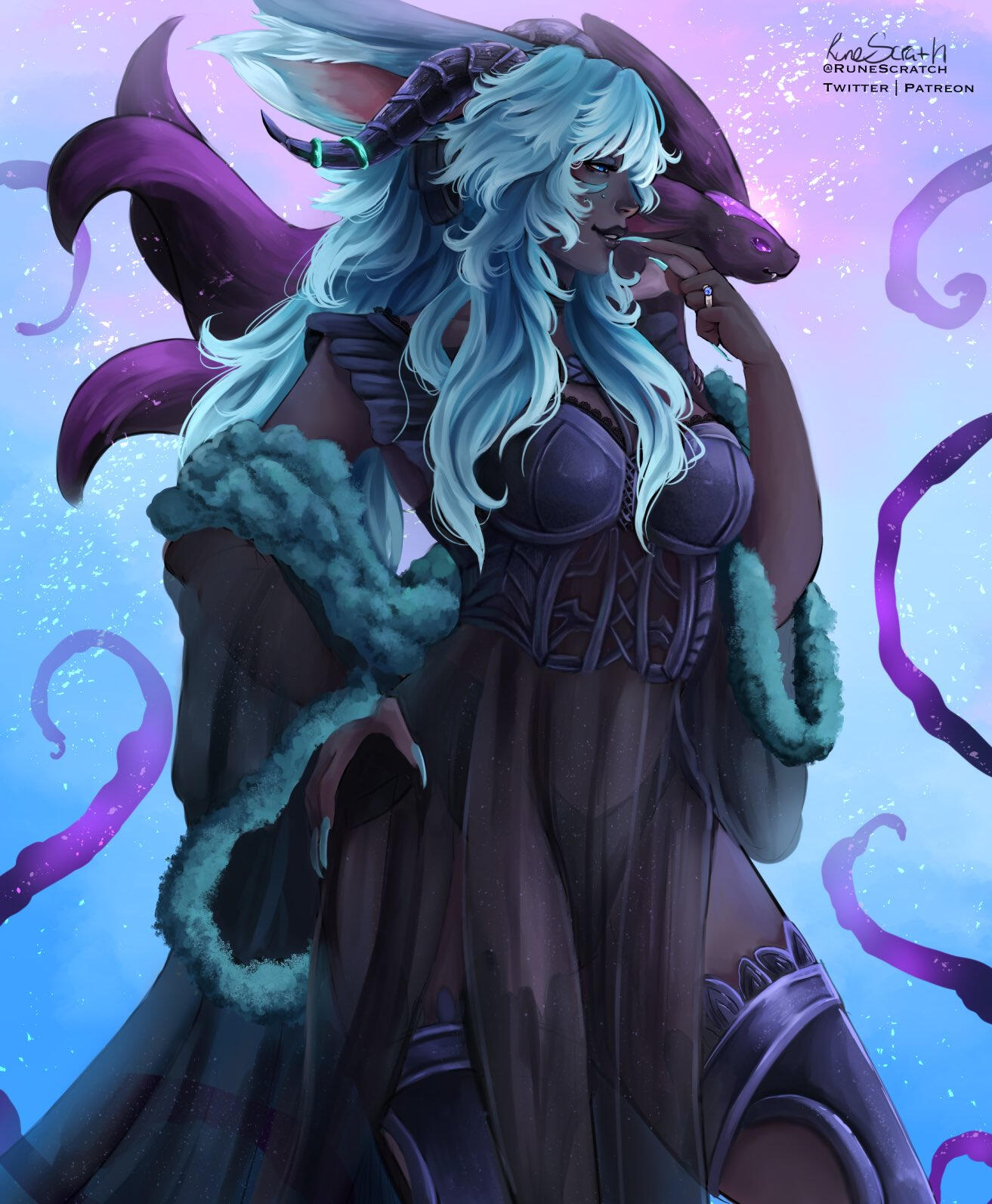 Her "pets" are often... on the wriggling side, and appear very void-like in terms of color, ranging from deep blue, to black, with the appearance of a galaxy to them.