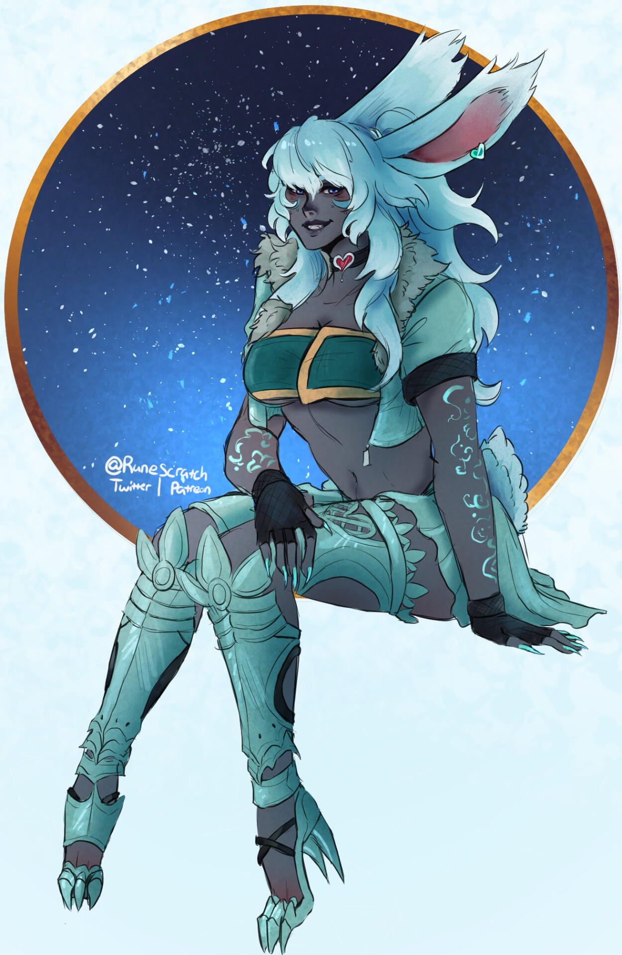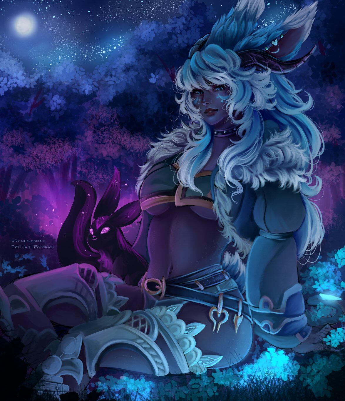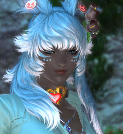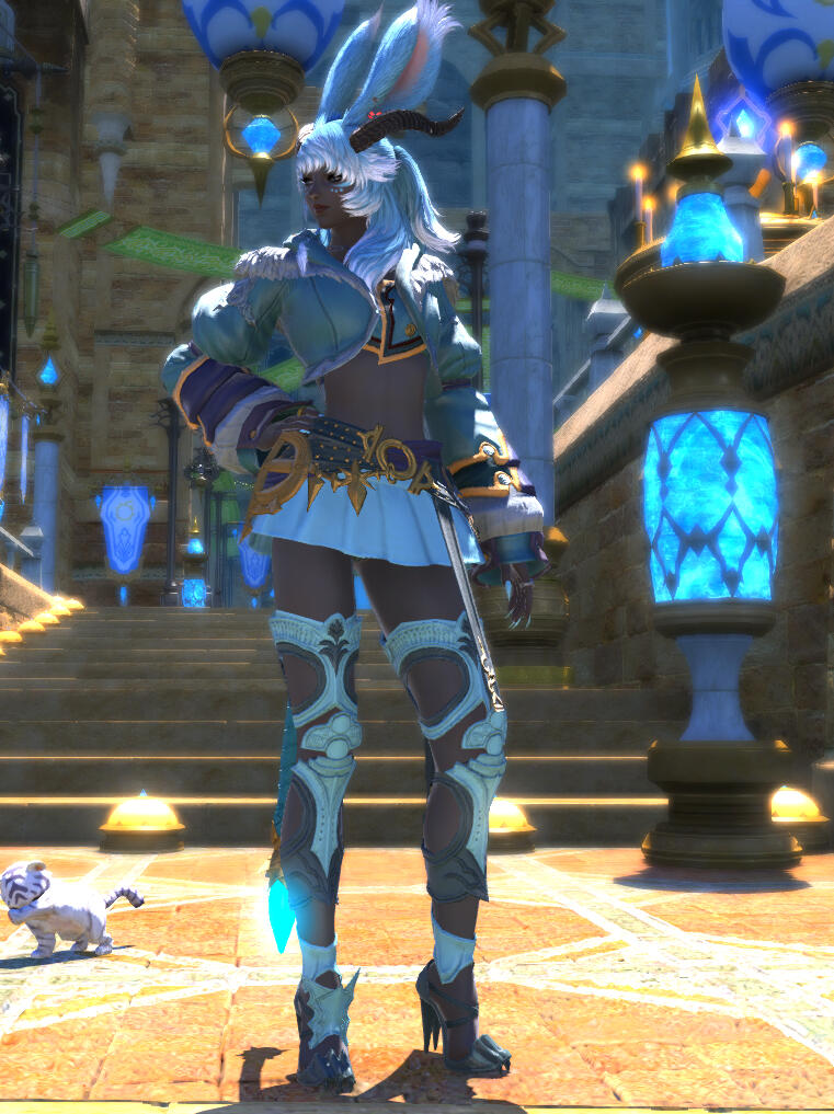 Appearance: Charcoal skin with pretty blue eyes and soft blue facial markings. Kafei is busty and tall, with long aqua blue hair with snow white accents that touches at mid thigh when it's not tied back into its usual tail. A small, fluffy rabbit tail that matches the color of her hair sits just above her rear. Usually, her hair is rather messy, and her ears needing groomed - but she's usually too into her work to worry about it. Has FFXII styled Viera feet, and natural claws.